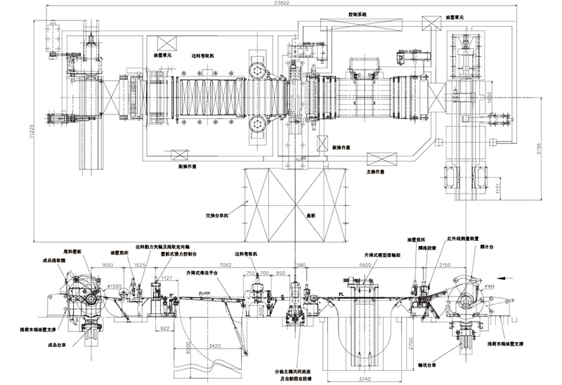 2.分條機主要構造:備料臺/上料臺車/開卷機/釋卷設備/前活套/基準邊側導輪組/押送對輪/分條主機/邊料卷取機/后活套/卷帶分隔設備/張力控制臺/卷取定向輪及出料動力夾輪/成品卷取機(無縫式卷筒)/油壓剪床二臺(一臺用于切頭另一臺用于分切)/成品臺車/卷筒末端油壓支撐二臺.